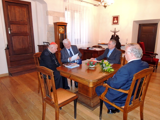 Kardinál Dziwisz pozorne počúva A. Barcíka, ktorý ho informuje o aktuálnych mierových aktivítách na pôde združenia Neformálne ekonomické fórum Hospodársky klub a jeho Medzinárodného mierového výboru (vpravo P. Čupka a vedľa neho poľský podnikateľ Bronislaw Brozda