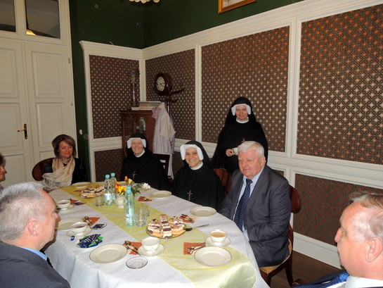Vikárka Kongregácia sestier Matky Božieho milosrdenstva v Krakove sestra Graciana (vedľa A. Barcíka) pozvala delegáciu Medzinárodného mierového výboru na desiatové občerstvenie