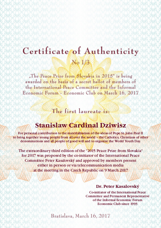Ocenenie za celoživotné dielo a všetko to, čo kardinál vykonal pre kresťanskú Európu a celú civilizáciu, osobitne ako najbližší spolupracovník pápeža sv. Jána Pavla II., odovzdali za Medzinárodný mierový výbor jeho člen Ing. Anton Barcík a jeden z prvých členov jubilujúceho združenia Neformálne ekonomické fórum Hospodársky klub Ing. Peter Čupka. Kardinál Stanislaw Dziwisz sa poďakoval za udelené ocenenie a prisľúbil, že svojimi modlitbami podporí aktivity združenia, ktoré smerujú k dôstojnému životu ľudí v mieri.