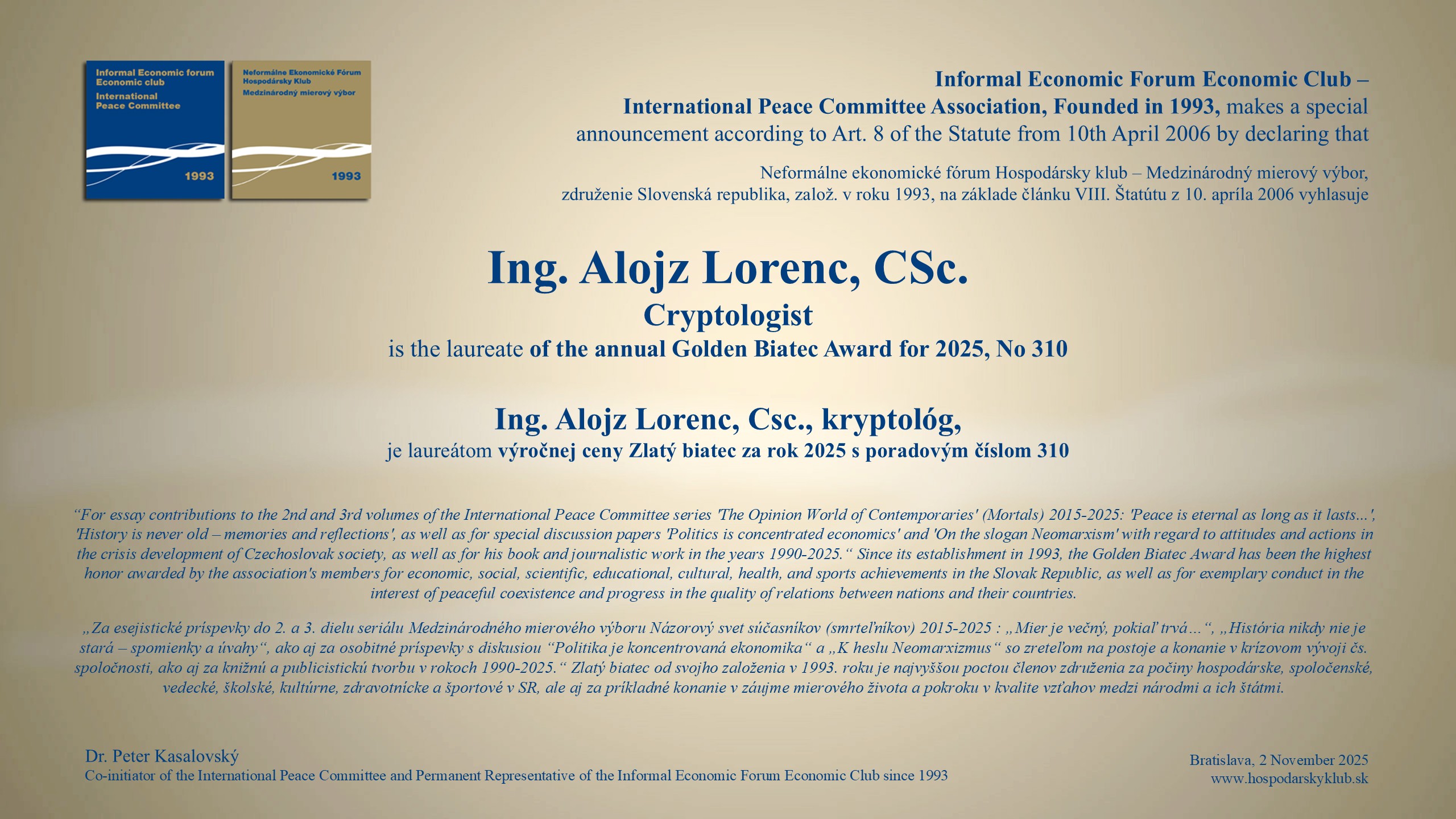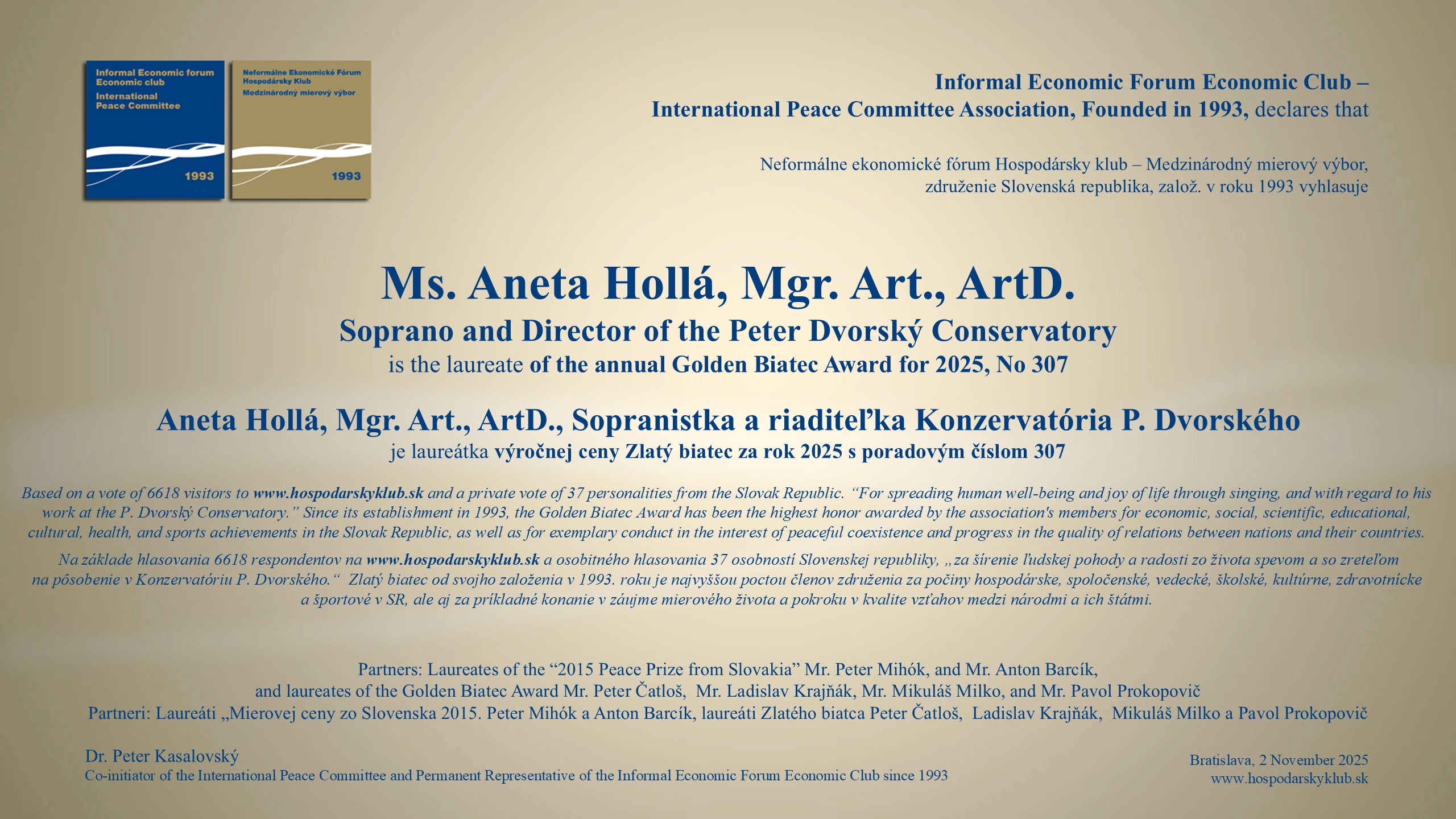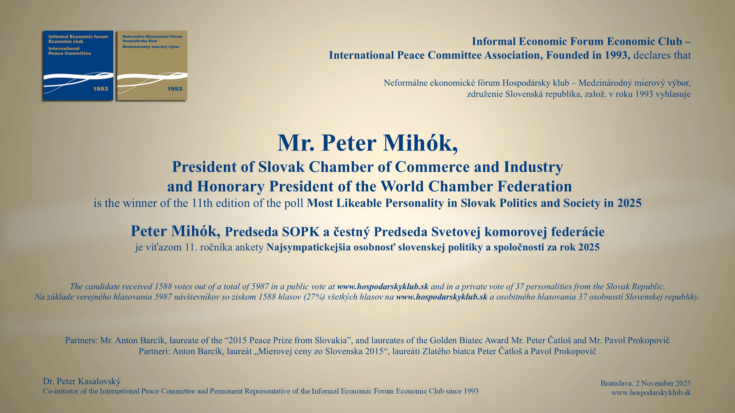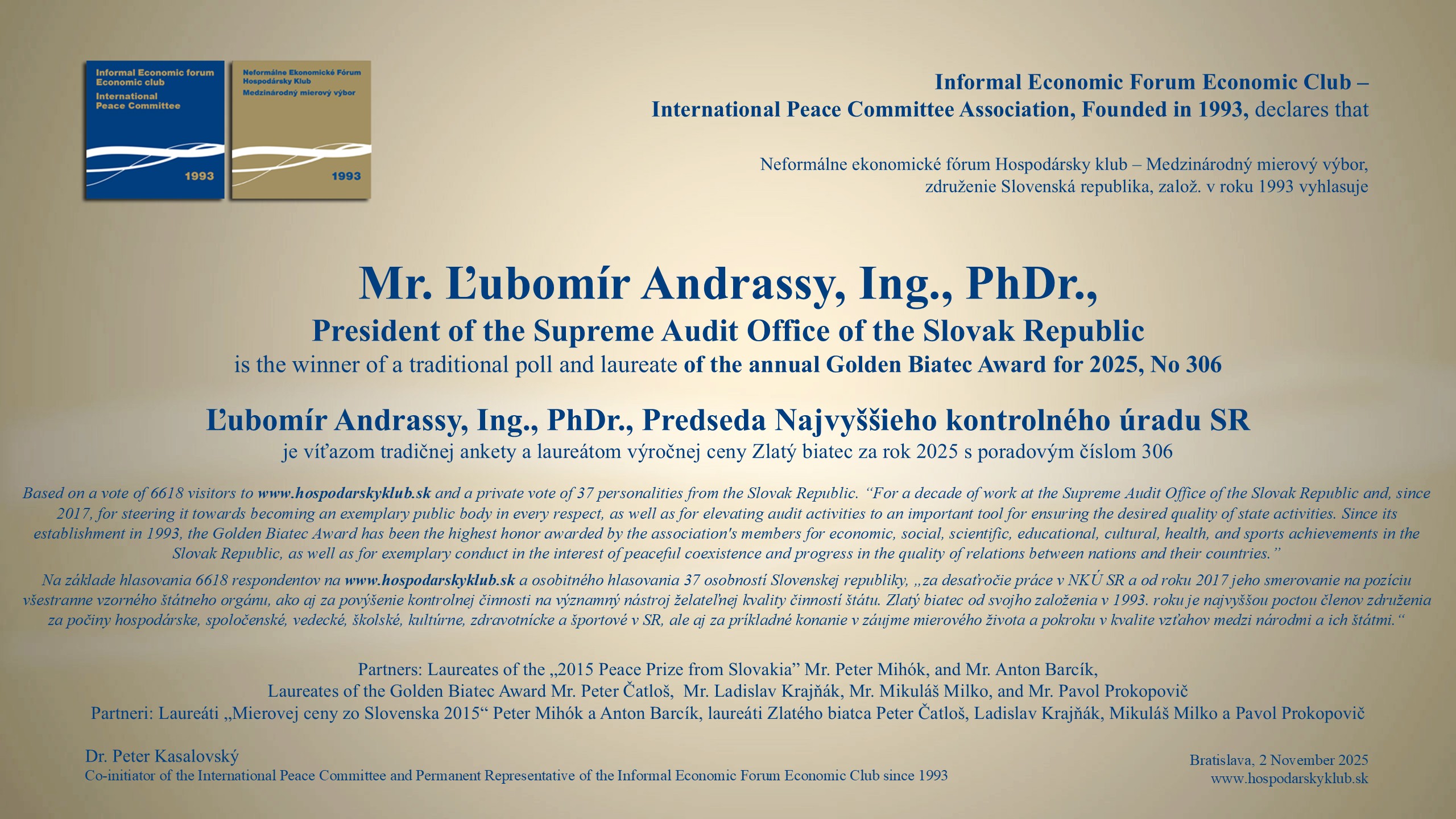 V najstaršom bratislavskom restaurante bola 4. decembra 2025 na pravé poludnie "Slávnosť na počesť skvelých osobností" : 36. laureáta "Mierovej ceny zo Slovenska 2015", piatich nových laureátov Zlatého biatca s poradím medailí od 306 do 310, víťazov tradičných ankiet World Politician, BEST BANK a Najsympatickejšia osobnosť slovenskej politiky a spoločnosti. Ceny odovzdávali reprezentanti vyše 32-ročného združenia a jeho Medzinárodného mierového výboru.