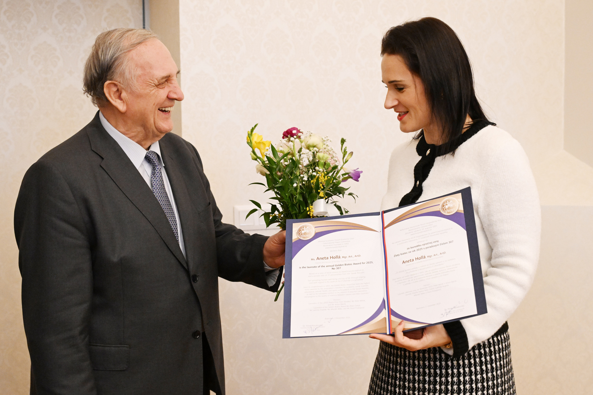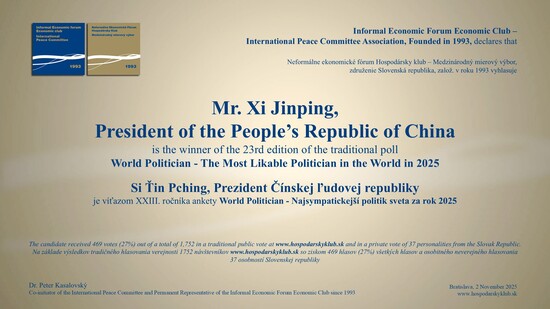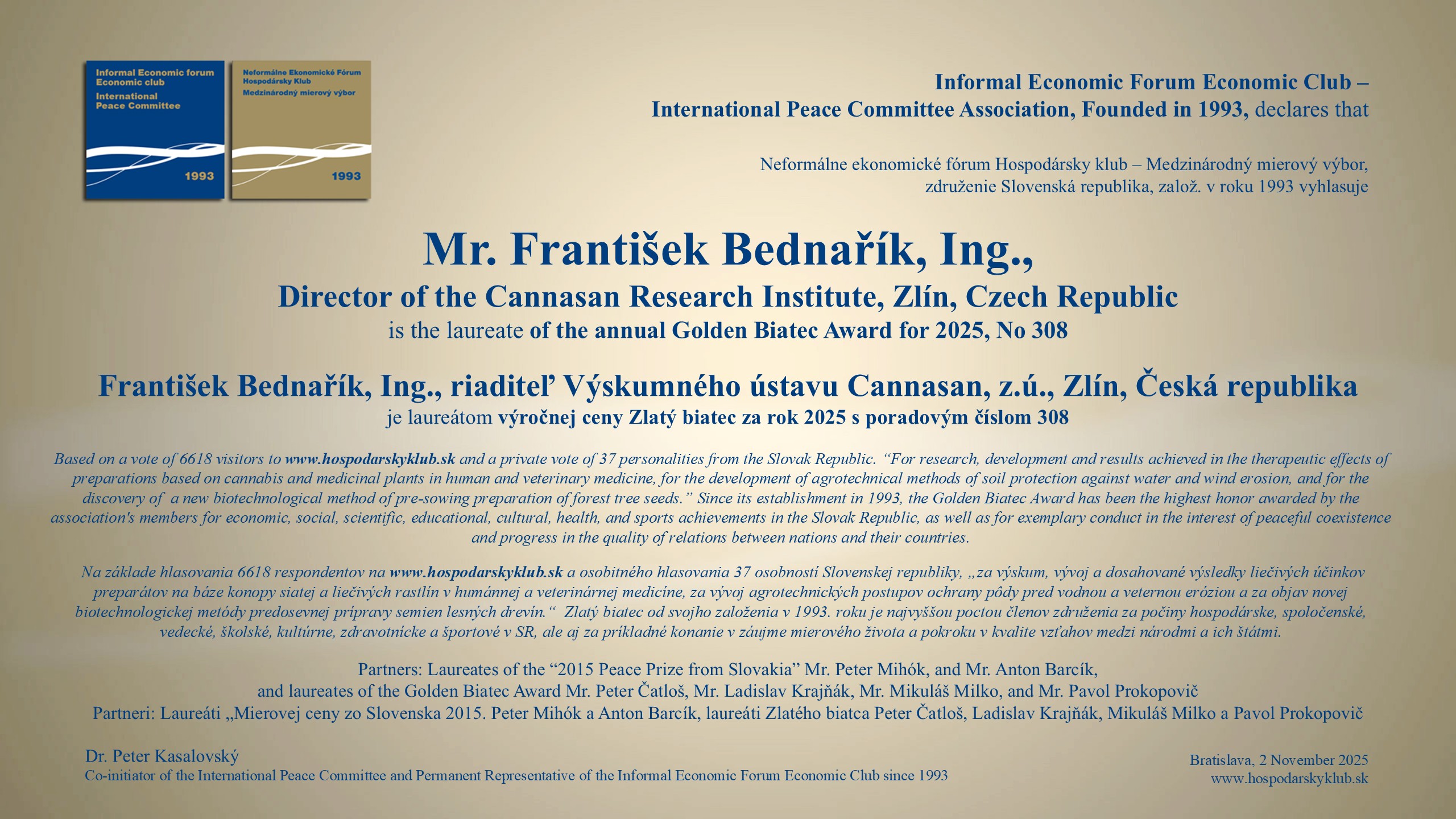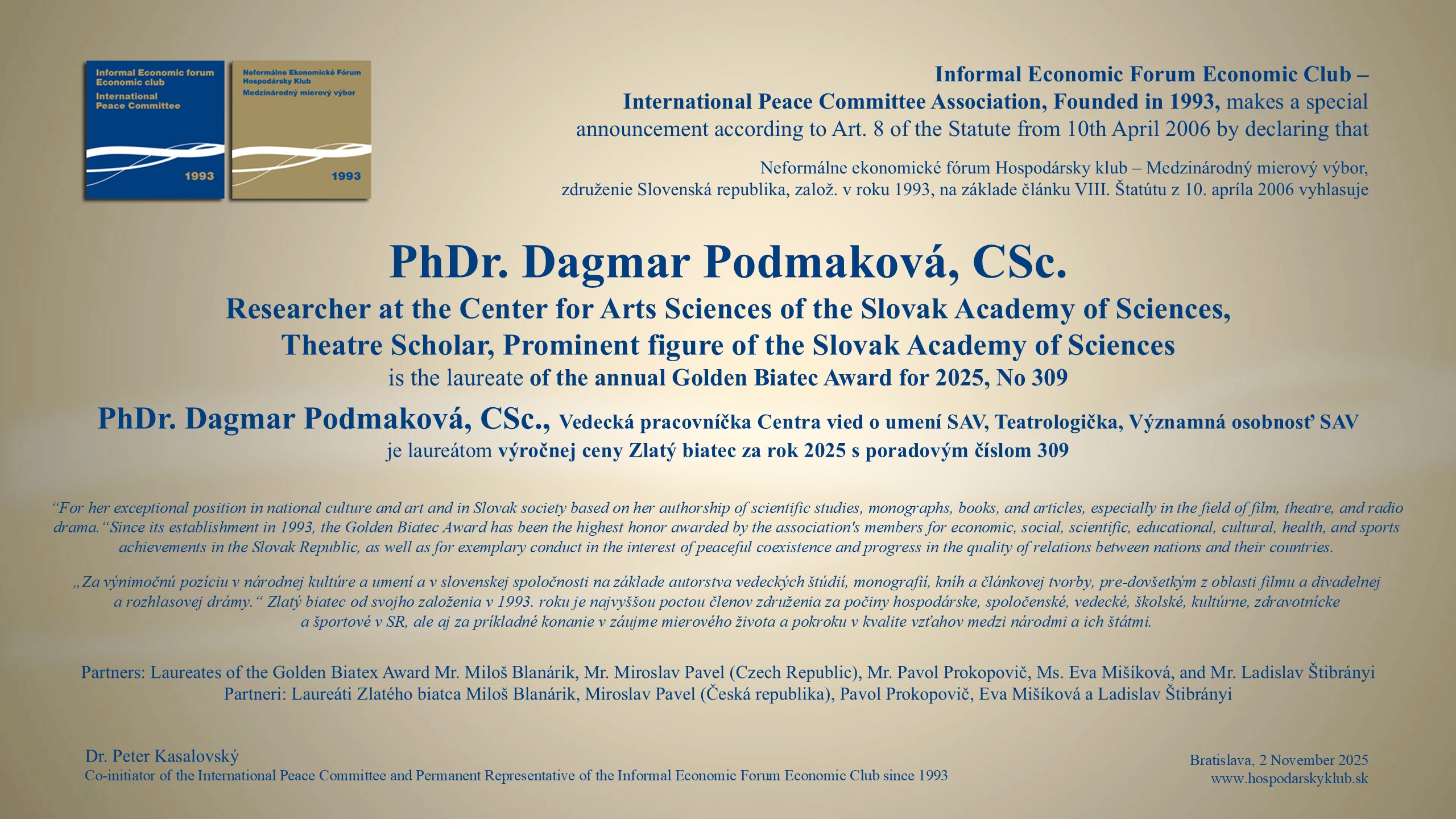 V najstaršom bratislavskom restaurante bola 4. decembra 2025 na pravé poludnie "Slávnosť na počesť skvelých osobností" : 36. laureáta "Mierovej ceny zo Slovenska 2015", piatich nových laureátov Zlatého biatca s poradím medailí od 306 do 310, víťazov tradičných ankiet World Politician, BEST BANK a Najsympatickejšia osobnosť slovenskej politiky a spoločnosti. Ceny odovzdávali reprezentanti vyše 32-ročného združenia a jeho Medzinárodného mierového výboru.