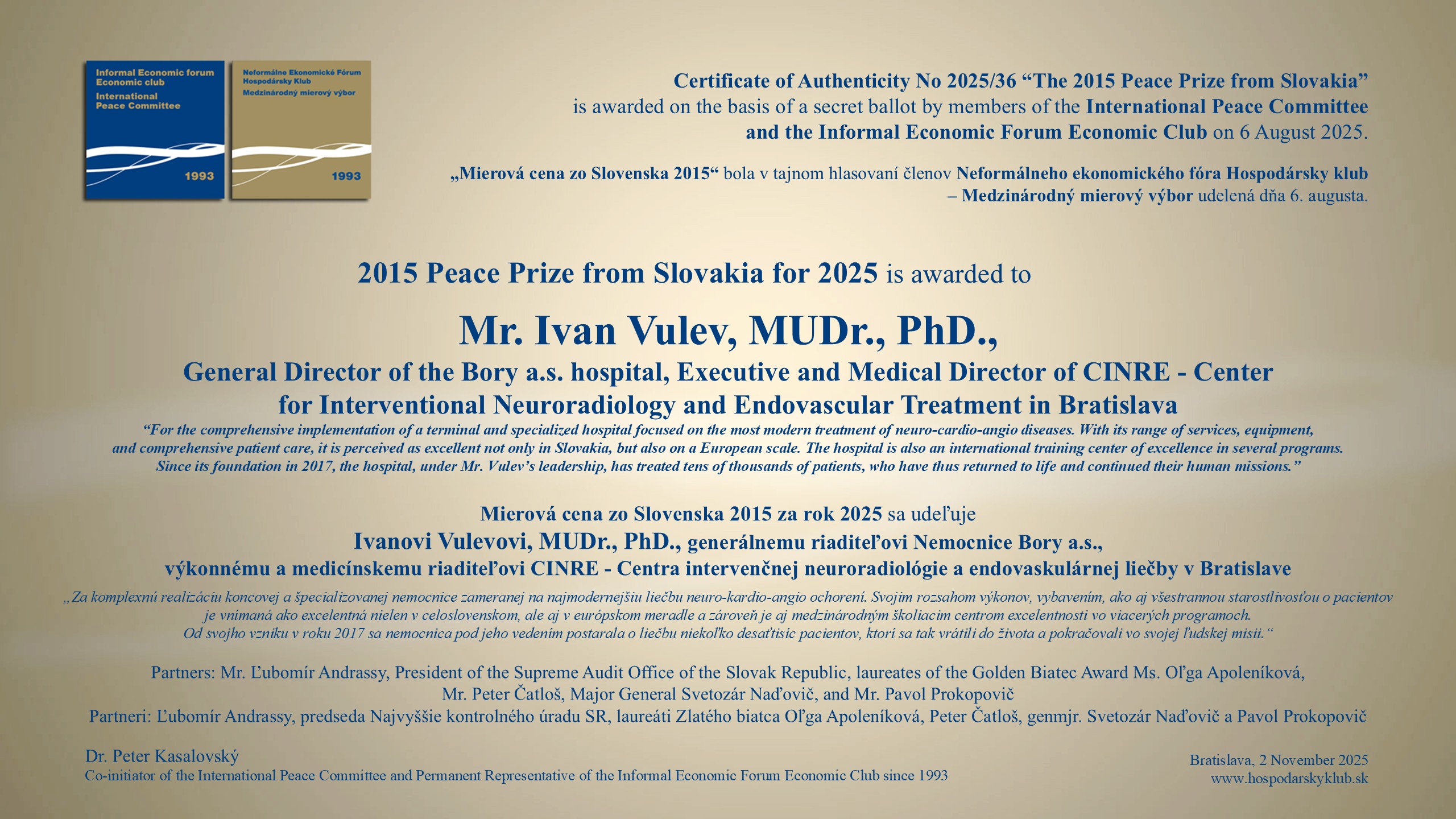 V poradí 36. laureátom "Mierovej ceny zo Slovenska 2015" za rok 2025 sa stal MUDr. Ivana Vuleva, PhD, ktorý založil a rozvíja Nemocnicu CINRE a pôsobí aj ako generálny riaditeľ Nemocnice Bory v Bratislave.