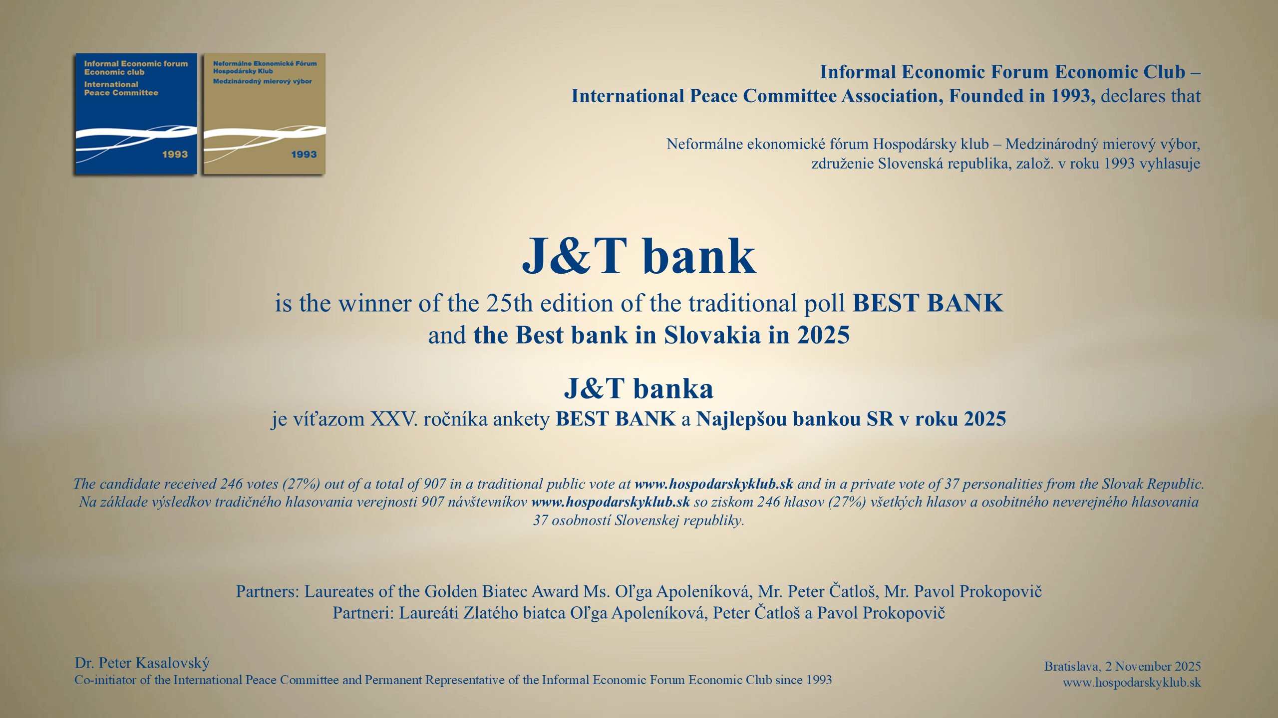 Víťazom XXV. ročníka ankety BEST BANK sa opäť stala J&T banka. Predstaviteľ J&T Group Jozef Tkáč sa ospravedlnil z neúčasti zo zdravotných dôvodov. Certifikát si prevezme v inom termíne.
